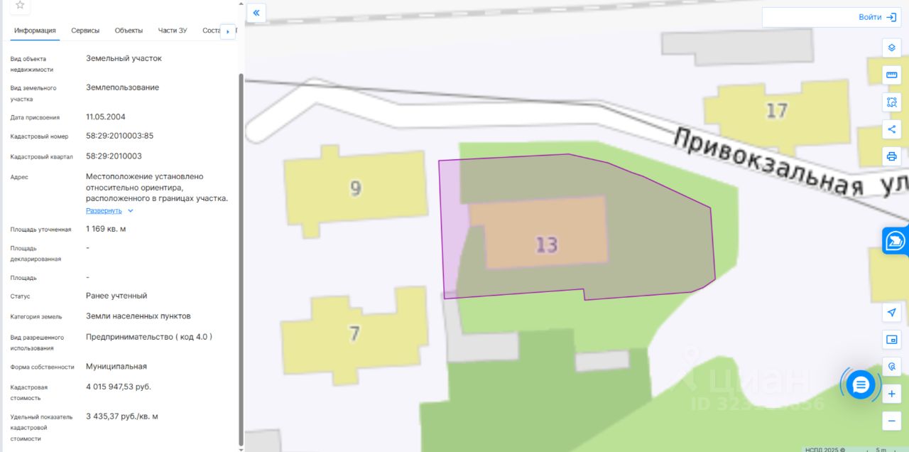 Адрес: Местоположение установлено относительно ориентира, расположенного в границах участка. Ориентир нежилое здание. Почтовый адрес ориентира: Российская Федерация, Пензенская область, городской округ город Пенза, город Пенза, улица Привокзальная, земельный участок 13. Площадь: 1169 кв. м. Кадастровый номер: 58:29:2010003:85. Разрешенное использование (назначение): предпринимательство (код 4.0).