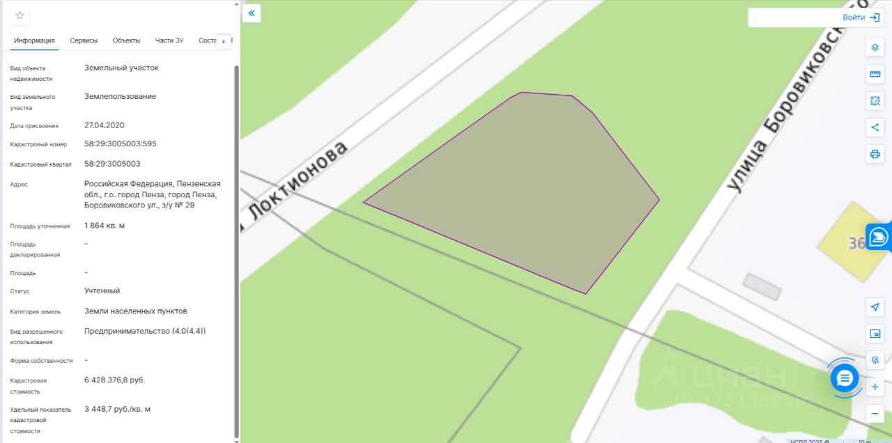 Адрес: Российская Федерация, Пензенская обл., г.о. город Пенза, город Пенза, Боровиковского ул., з/у 29. Площадь: 1864 кв. м. Кадастровый номер: 58:29:3005003:595. Разрешенное использование (назначение): предпринимательство (4.0(4.4)).