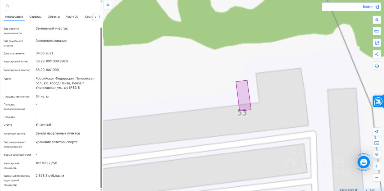Адрес: Российская Федерация, Пензенская обл., г.о. город Пенза, Пенза г., Ульяновская ул., з/у 53 Б. Площадь: 64 кв. м. Кадастровый номер: 58:29:1001009:2926. Разрешенное использование (назначение): хранение автотранспорта.