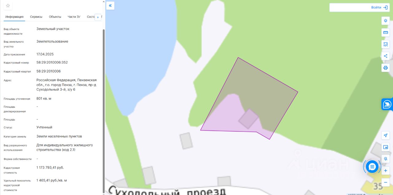 Адрес: Российская Федерация, Пензенская обл., г.о. город Пенза, г. Пенза, пр-д Суходольный 3-й, з/у 6. Площадь: 801 кв. м. Кадастровый номер: 58:29:2010006:352. Разрешенное использование (назначение): для индивидуального жилищного строительства (код. 2.1).
