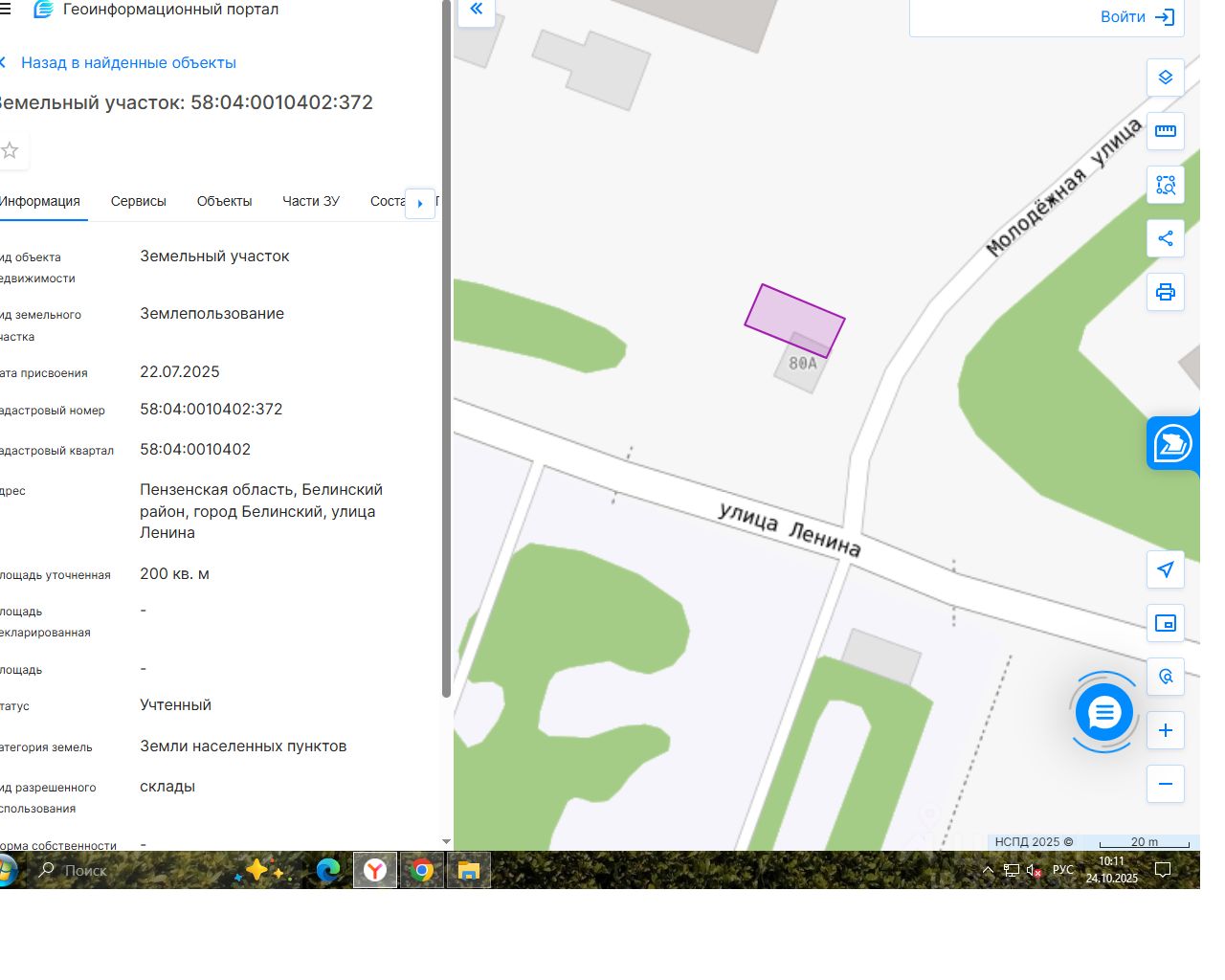 Земельный участок, государственная собственность на который не разграничена, из земель населенных пунктов с кадастровым номером: 58:04:0010402:372, площадью 200 кв. м., расположенного по адресу: Пензенская область, Белинский район, г. Белинский, ул. Ленина, разрешенное использование: склады.