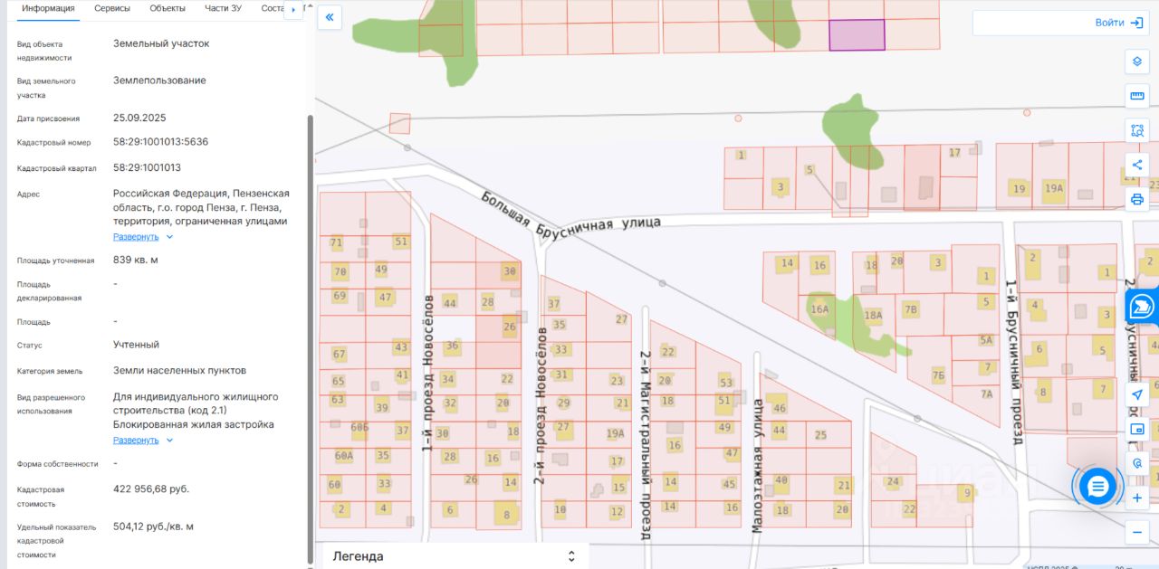 Адрес: Российская Федерация, Пензенская область, г.о. город Пенза, г. Пенза, территория, ограниченная улицами Новоселов, Героя России Сергеева, границей садоводческих, огороднических или дачных некоммерческих объединений граждан, южнее границы индивидуальной жилой застройки по ул. Большая Брусничная. Площадь: 839 кв. м. Кадастровый номер: 58:29:1001013:5636. Разрешенное использование (назначение): Для индивидуального жилищного строительства (код 2.1) Блокированная жилая застройка (код 2.3).
