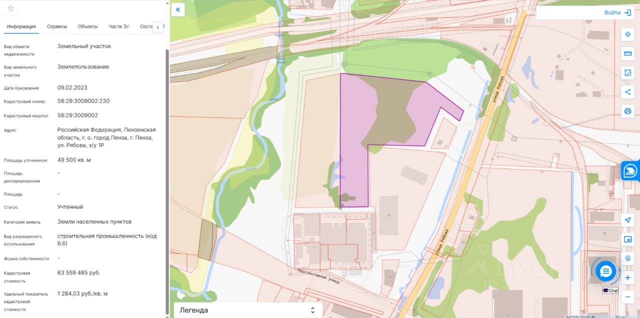 Адрес: Российская Федерация, Пензенская область, г. о. город Пенза, г. Пенза, ул. Рябова, з/у 1Р. Площадь: 49500 кв. м. Кадастровый номер: 58:29:3009002:230. Разрешенное использование (назначение): строительная промышленность (6.6).