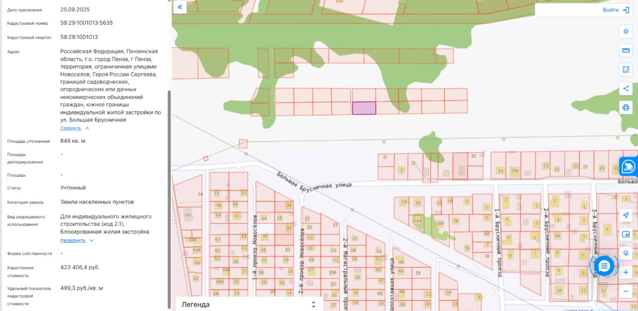 Адрес: Российская Федерация, Пензенская область, г.о. город Пенза, г Пенза, территория, ограниченная улицами Новоселов, Героя России Сергеева, границей садоводческих, огороднических или дачных некоммерческих объединений граждан, южнее границы индивидуальной жилой застройки по ул. Большая Брусничная. Площадь: 848 кв. м. Кадастровый номер: 58:29:1001013:5635. Разрешенное использование (назначение): Для индивидуального жилищного строительства (код 2.1), Блокированная жилая застройка (код 2.3).