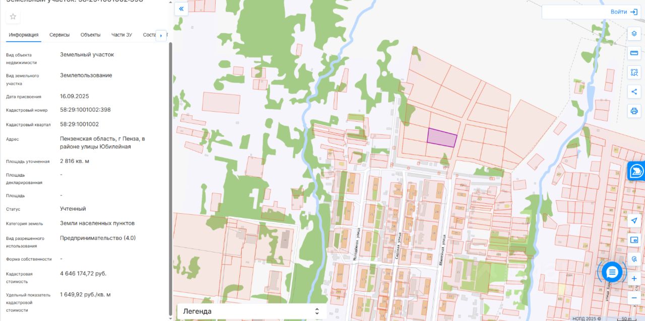 Адрес: Пензенская область, г Пенза, в районе улицы Юбилейная. Площадь: 2816 кв. м. Кадастровый номер: 58:29:1001002:398. Разрешенное использование (назначение): Предпринимательство (код 4.0).