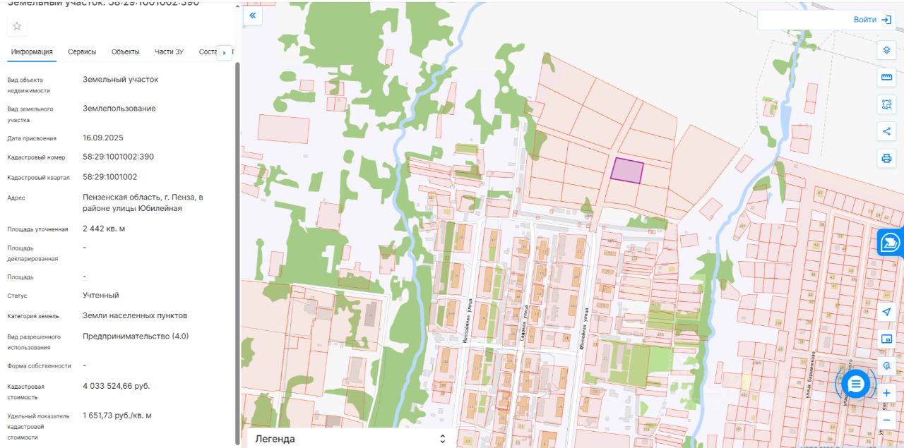 Адрес: Пензенская область, г. Пенза, в районе улицы Юбилейная. Площадь: 2442 кв. м. Кадастровый номер: 58:29:1001002:390. Разрешенное использование (назначение): Предпринимательство (4.0)