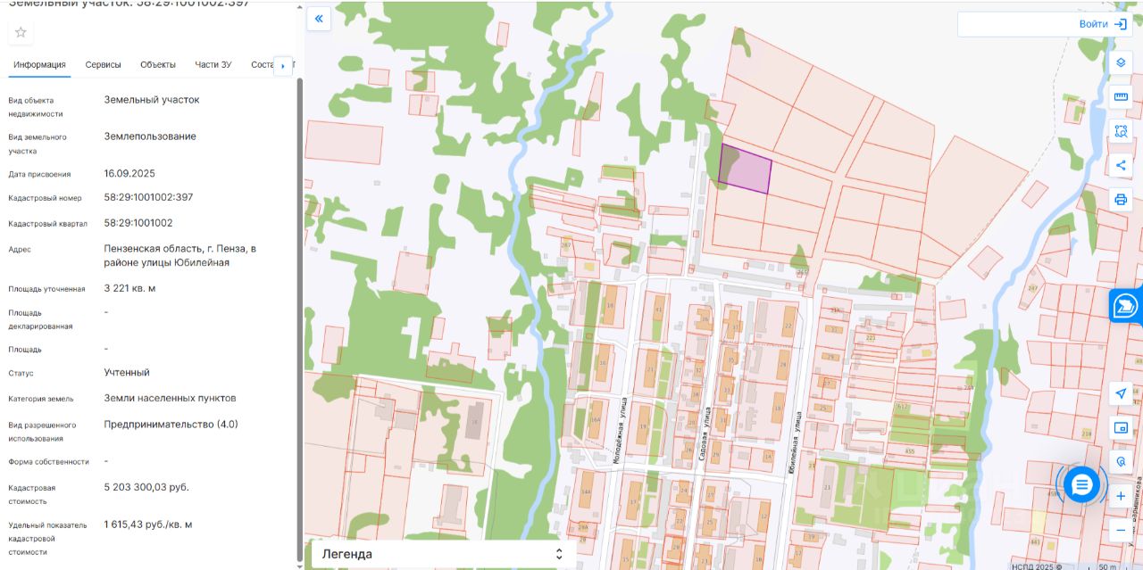 Адрес: Пензенская область, г. Пенза, в районе улицы Юбилейная. Площадь: 3221 кв. м. Кадастровый номер: 58:29:1001002:397. Разрешенное использование (назначение): Предпринимательство (код 4.0)