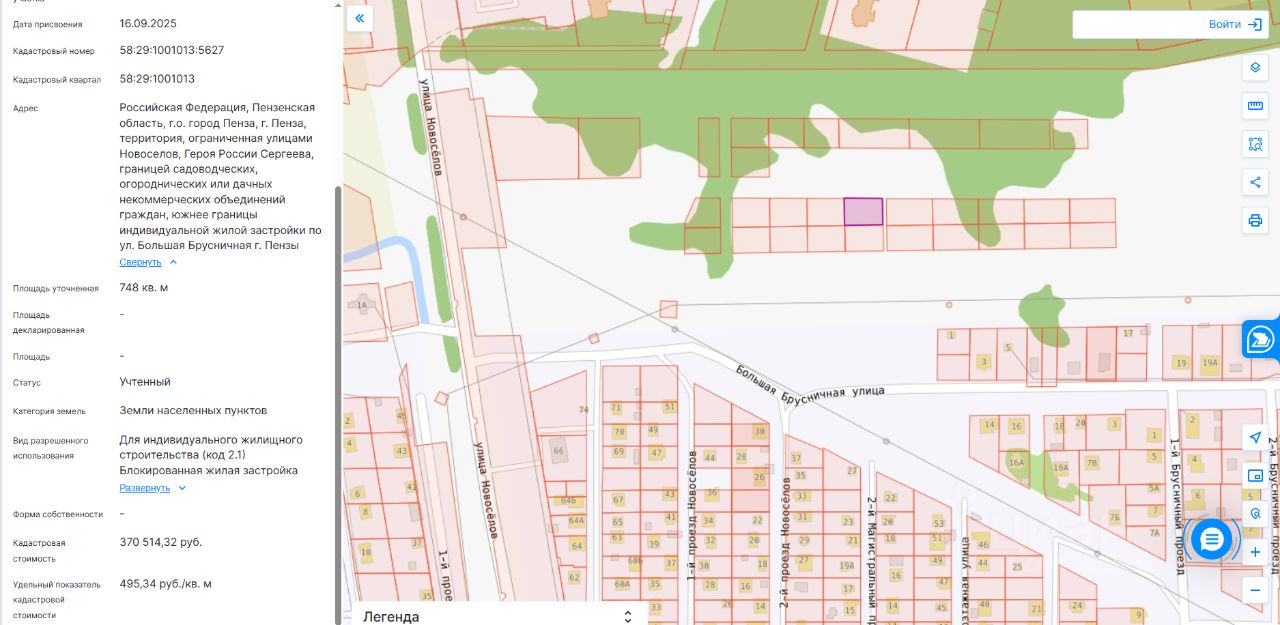 Адрес: Российская Федерация, Пензенская область, г.о. город Пенза, г. Пенза, территория, ограниченная улицами Новоселов, Героя России Сергеева, границей садоводческих, огороднических или дачных некоммерческих объединений граждан, южнее границы индивидуальной жилой застройки по ул. Большая Брусничная г. Пензы. Площадь: 748 кв. м. Кадастровый номер: 58:29:1001013:5627. Разрешенное использование (назначение): Для индивидуального жилищного строительства (код 2.1) Блокированная жилая застройка (код 2.3).
