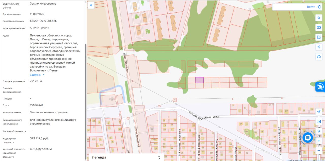 Адрес: Пензенская область, г.о. город Пенза, г. Пенза, территория, ограниченная улицами Новоселов, Героя России Сергеева, границей садоводческих, огороднических или дачных некоммерческих объединений граждан, южнее границы индивидуальной жилой застройки по ул. Большая Брусничная г. Пензы. Площадь: 771 кв. м. Кадастровый номер: 58:29:1001013:5625. Разрешенное использование (назначение): для индивидуального жилищного строительства.