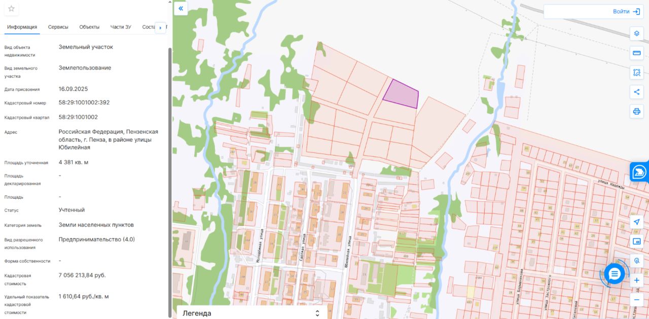 Адрес: Российская Федерация, Пензенская область, г. Пенза, в районе улицы Юбилейная. Площадь: 4381 кв. м. Кадастровый номер: 58:29:1001002:392. Разрешенное использование (назначение): Предпринимательство (код 4.0).