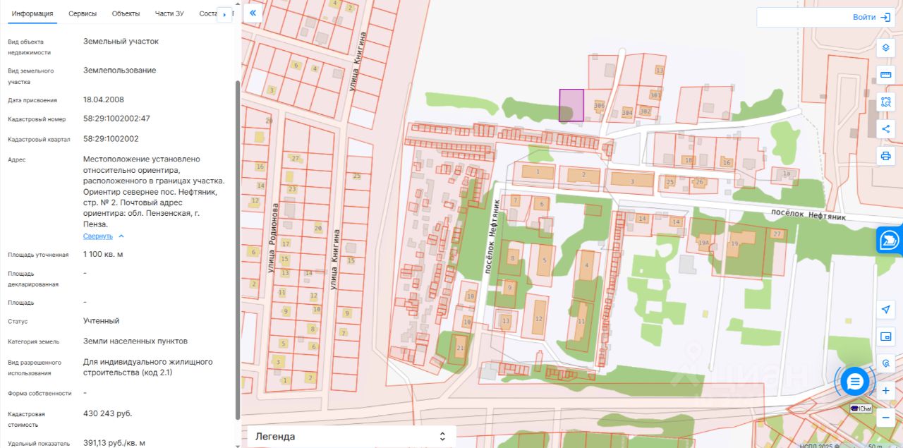 Адрес: Местоположение установлено относительно ориентира, расположенного в границах участка. Ориентир севернее пос. Нефтяник, стр. 2. Почтовый адрес ориентира: обл. Пензенская, г. Пенза. Площадь: 1100 кв. м. Кадастровый номер: 58:29:1002002:47. Разрешенное использование (назначение): Для индивидуального жилищного строительства (код 2.1).
