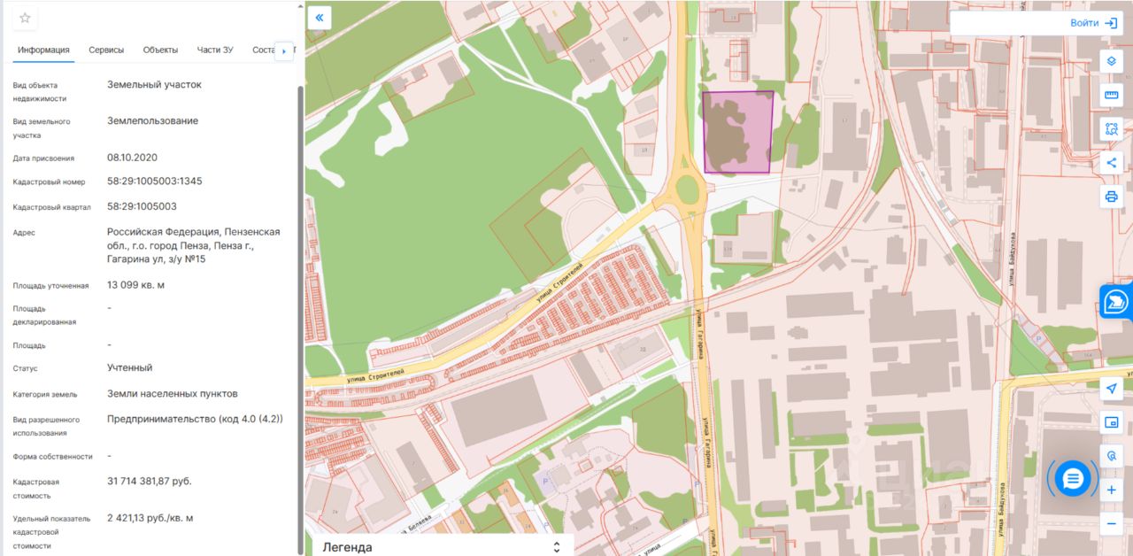 Адрес: Российская Федерация, Пензенская обл., г.о. город Пенза, Пенза г., Гагарина ул, з/у 15. Площадь: 13099 кв. м. Кадастровый номер: 58:29:1005003:1345. Разрешенное использование (назначение): Предпринимательство (код 4.0 (4.2))