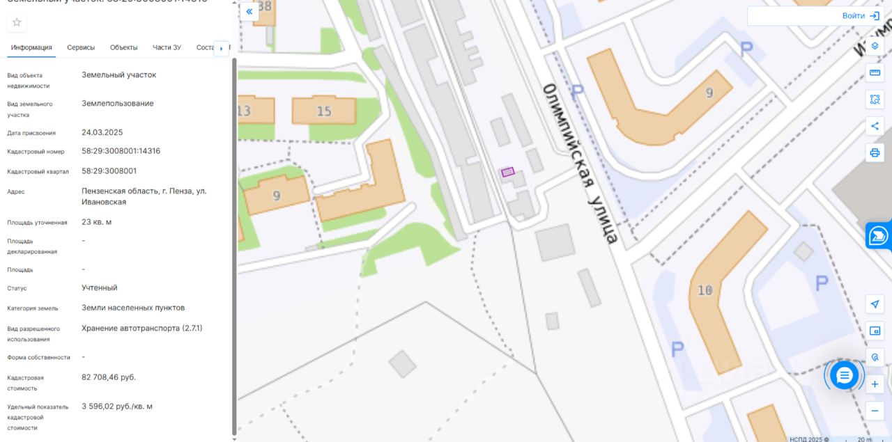 Адрес: Пензенская область, г. Пенза, ул. Ивановская. Площадь: 23 кв. м. Кадастровый номер: 58:29:3008001:14316. Разрешенное использование (назначение): Хранение автотранспорта (2.7.1).