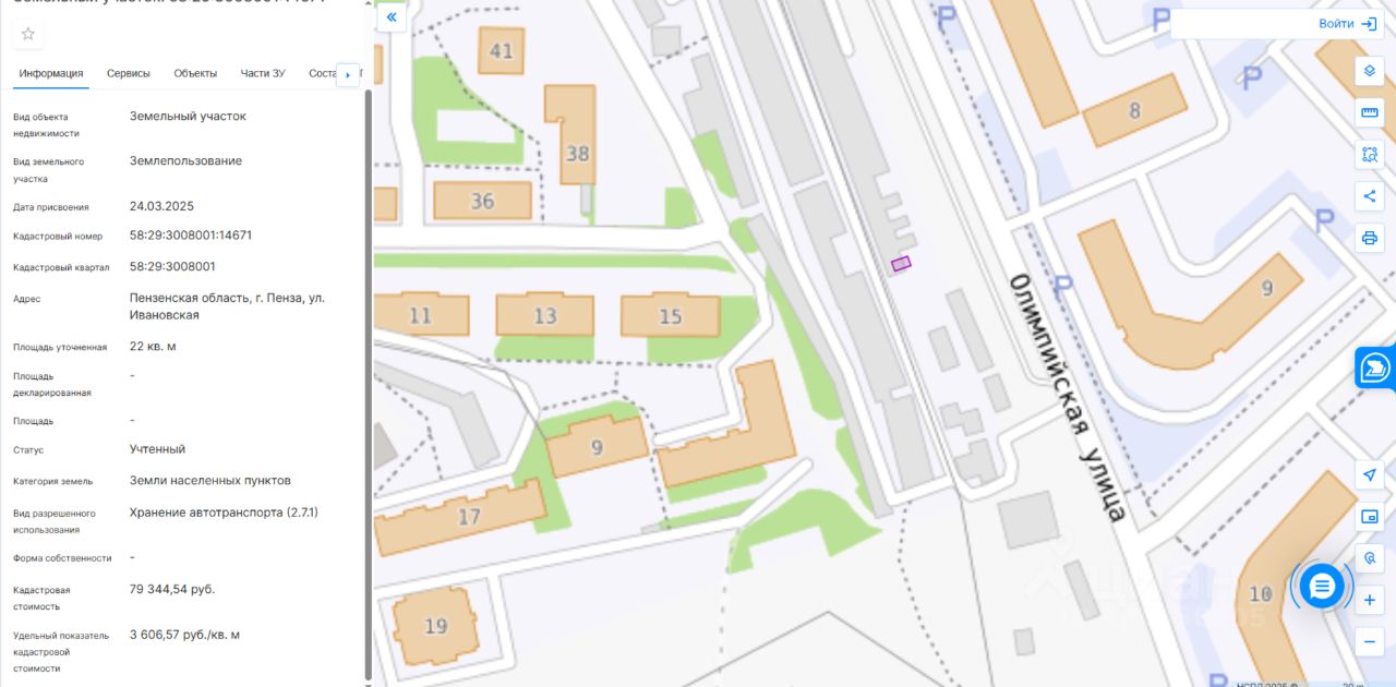Адрес: Пензенская область, г. Пенза, ул. Ивановская. Площадь: 22 кв. м. Кадастровый номер: 58:29:3008001:14671. Разрешенное использование (назначение): Хранение автотранспорта (2.7.1).