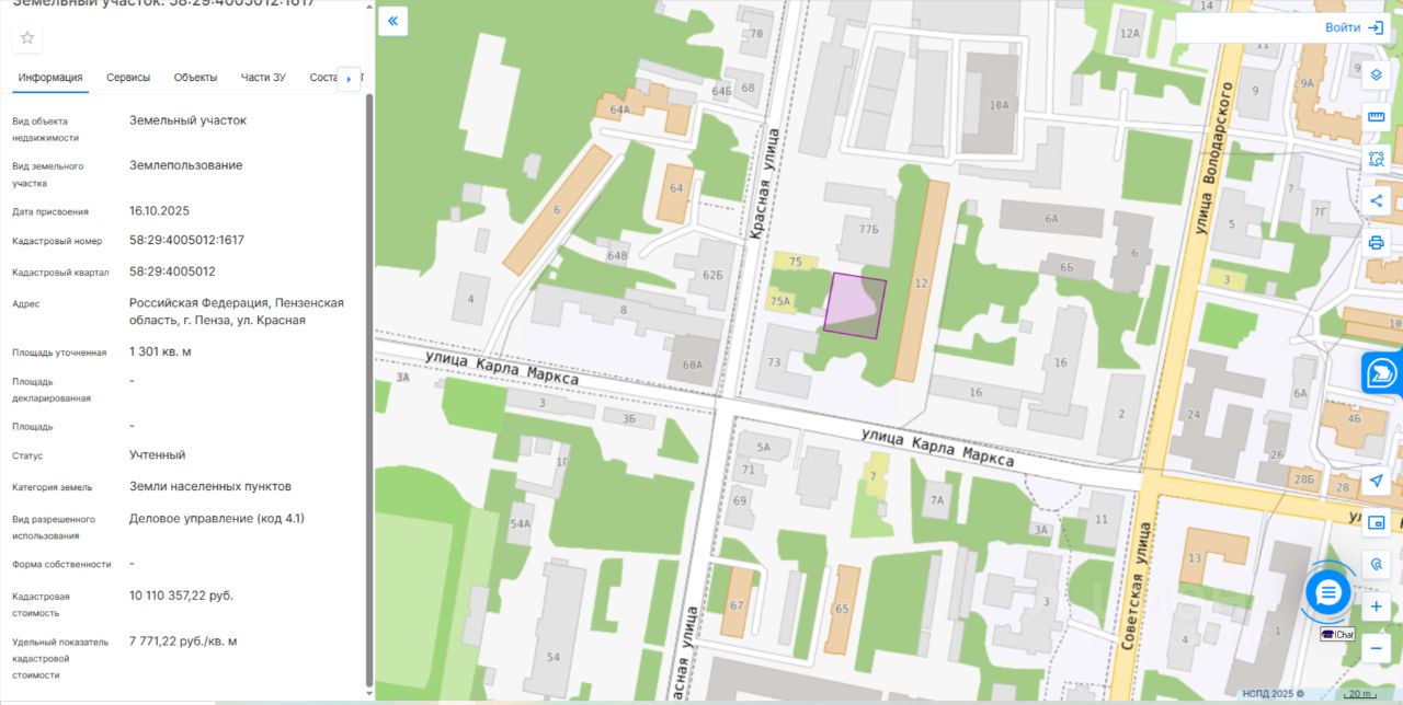 Адрес: Российская Федерация, Пензенская область, г. Пенза, ул. Красная. Площадь: 1301 кв. м. Кадастровый номер: 58:29:4005012:1617. Разрешенное использование (назначение): Деловое управление (код 4.1).