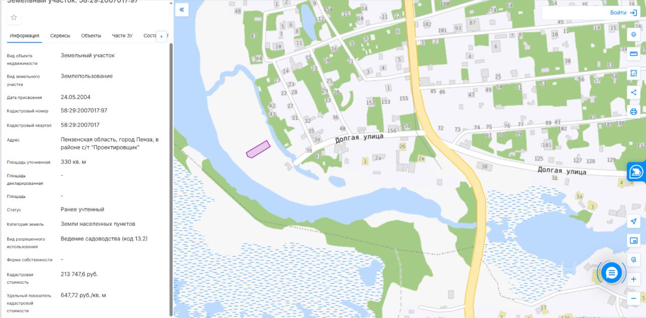 Адрес: Пензенская область, город Пенза, в районе с/т "Проектировщик". Площадь: 330 кв. м. Кадастровый номер: 58:29:2007017:97. Разрешенное использование (назначение): Ведение садоводства (код 13.2).