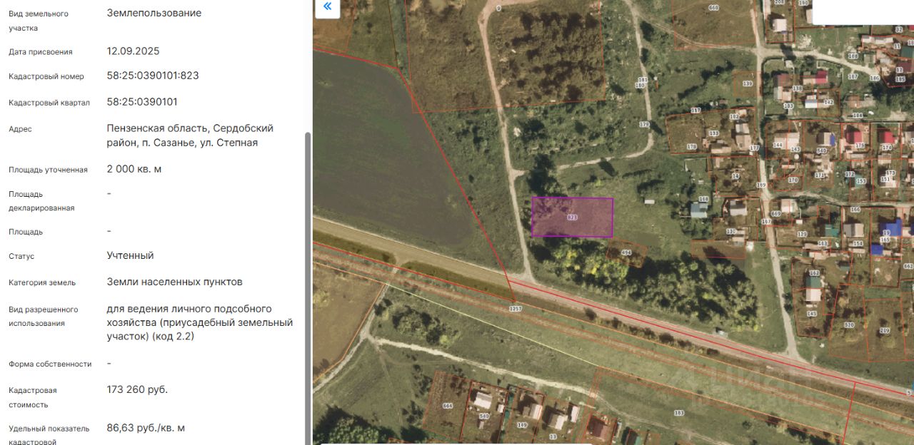 Земельный участок из категории земель - земли населенных пунктов, разрешенное использование для ведения личного подсобного хозяйства (приусадебный земельный участок) (код 2.2), с кадастровым номером 58:25:0390101:823, общей площадью 2000 кв.м, адрес (местоположение) объекта: Пензенская область, Сердобский район, п. Сазанье, ул. Степная. Цель использования - для ведения личного подсобного хозяйства в границах населенного пункта.