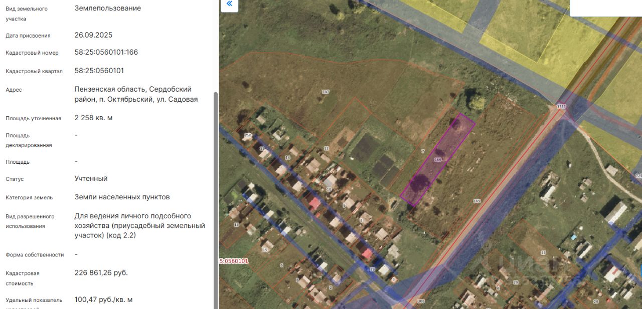 Земельный участок из категории земель - земли населенных пунктов, разрешенное использование для ведения личного подсобного хозяйства (приусадебный земельный участок) (код 2.2), с кадастровым номером 58:25:0560101:166, общей площадью 2258 кв.м, адрес (местоположение) объекта: Пензенская область, Сердобский район, п. Октябрьский, ул. Садовая. Цель использования - для ведения личного подсобного хозяйства в границах населенного пункта.
