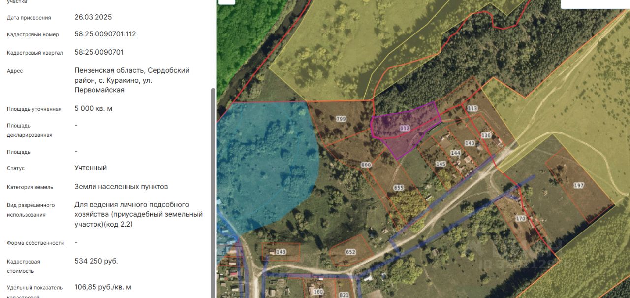 Земельный участок из категории земель - земли населенных пунктов, разрешенное использование для ведения личного подсобного хозяйства (приусадебный земельный участок) (код 2.2), с кадастровым номером 58:25:0090701:112, общей площадью 5000 кв.м. Адрес (местоположение) объекта: Пензенская область, Сердобский район, с. Куракино, ул. Первомайская. Цель использования - для ведения личного подсобного хозяйства в границах населенного пункта.
