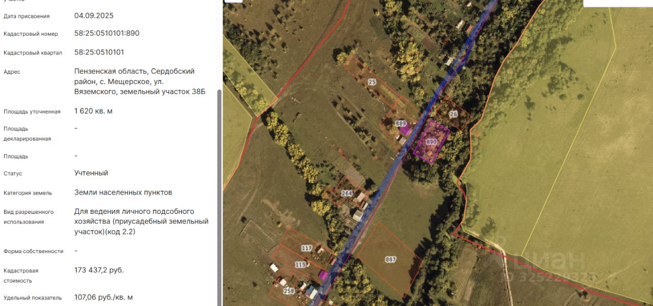 Земельный участок из категории земель - земли населенных пунктов, разрешенное использование для ведения личного подсобного хозяйства (приусадебный земельный участок) (код 2.2), с кадастровым номером 58:25:0510101:890, общей площадью 1620 кв.м., адрес (местоположение) объекта: Пензенская область, Сердобский район, с. Мещерское, ул. Вяземского, земельный участок 38Б. Цель использования - для ведения личного подсобного хозяйства в границах населенного пункта.