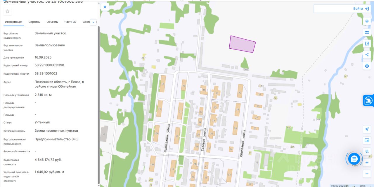 Адрес: Пензенская область, г Пенза, в районе улицы Юбилейная. Площадь: 2816 кв. м. Кадастровый номер: 58:29:1001002:398. Разрешенное использование (назначение): Предпринимательство (код 4.0).