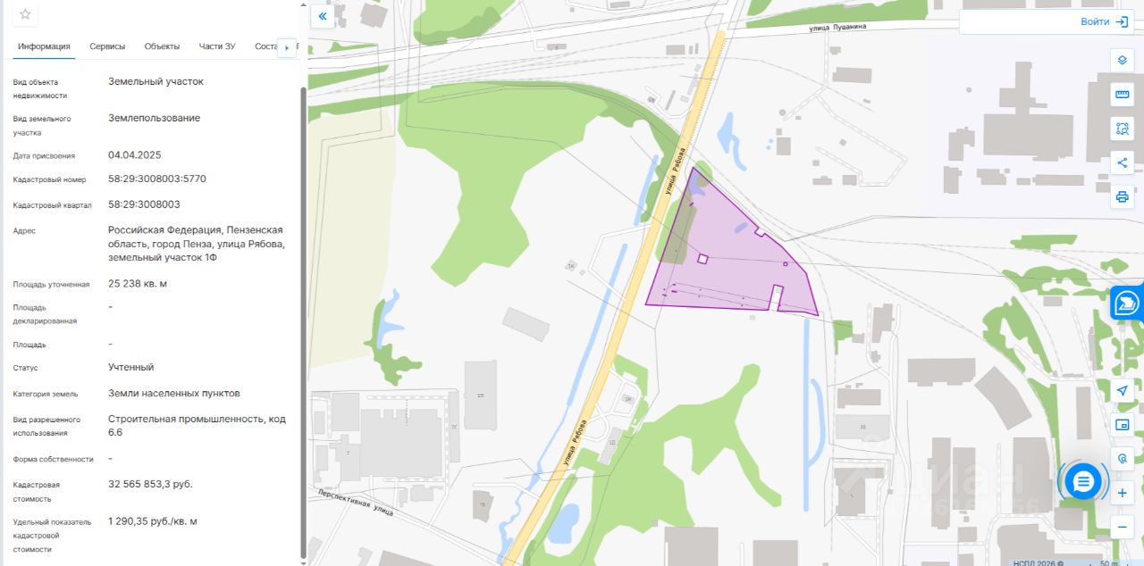 Адрес: Российская Федерация, Пензенская область, город Пенза, улица Рябова, земельный участок 1Ф. Площадь: 25238 кв. м. Кадастровый номер: 58:29:3008003:5770. Разрешенное использование (назначение): Строительная промышленность, код 6.6.