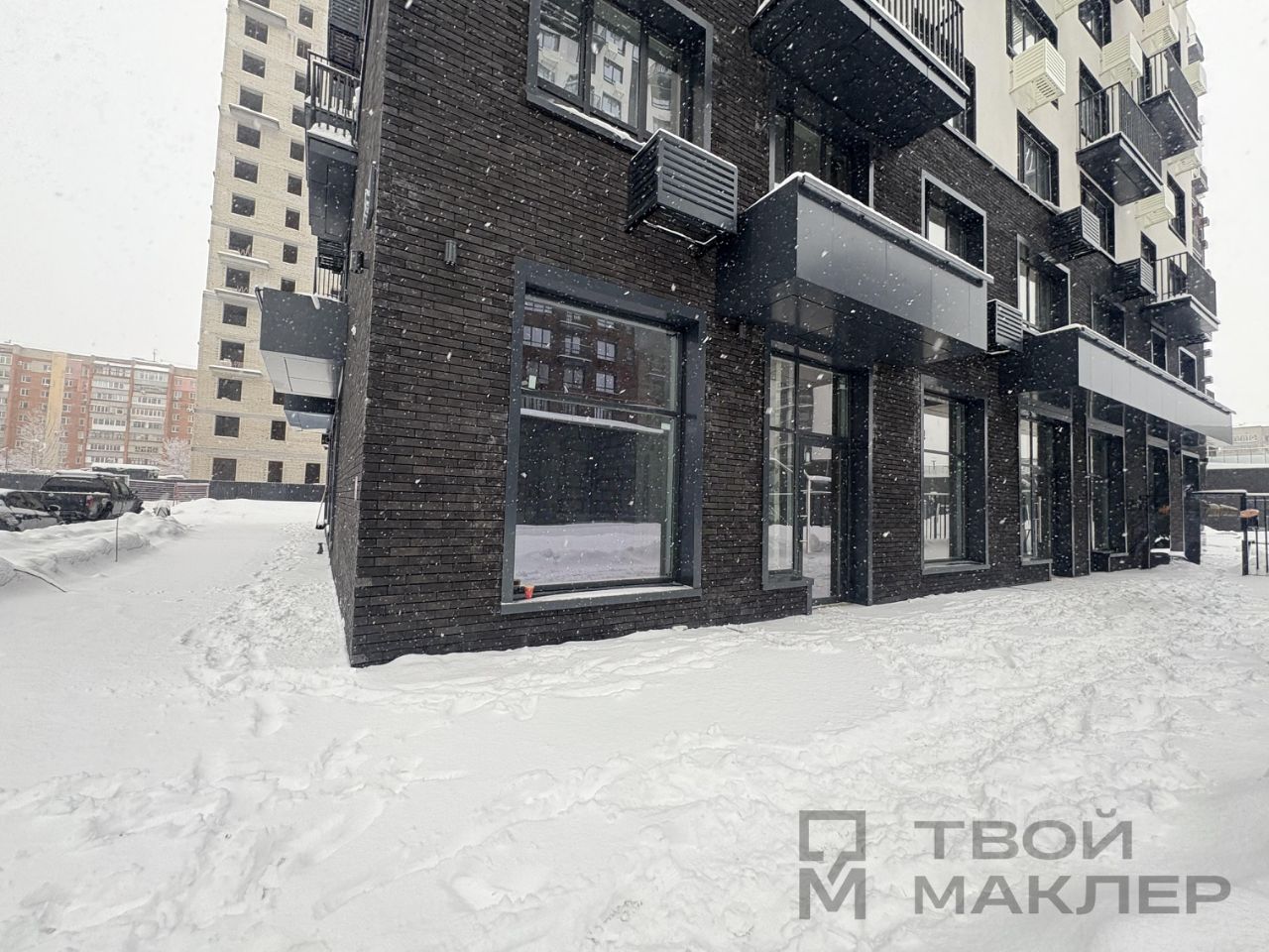 Рядом со входом в помещение вход на огороженную территорию ЖК и въезд в паркинг.