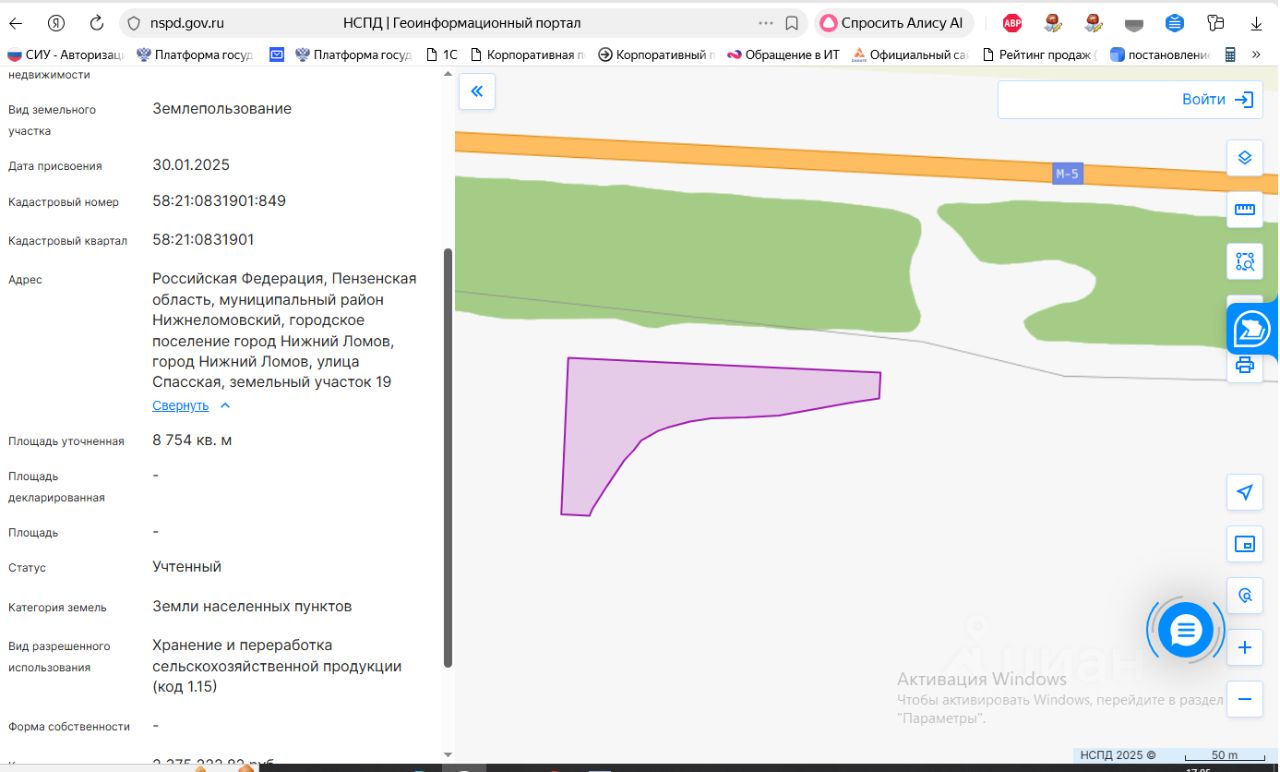 земельный участок из земель населенных пунктов, площадью 8754 кв.м., местоположение: Пензенская область, Нижнеломовский район, г. Нижний Ломов, ул. Спасская, земельный участок 19, с кадастровым номером 58:21:0831901:849, разрешенное использование: "хранение и переработка сельскохозяйственной продукции"