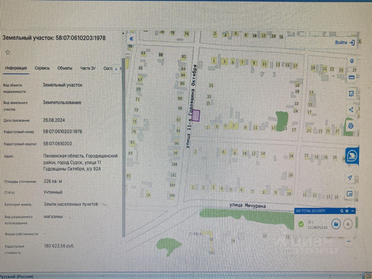 земельный участок, государственная собственность на который не разграничена, свободный от прав третьих лиц, площадью 326 (триста двадцать шесть) кв. м., из категории земель - земли населенных пунктов, с кадастровым номером 58:07:0610203:1978, местоположение: Российская Федерация, Пензенская область, Городищенский район, г. Сурск, ул. 11 Годовщины Октября, з/у 92А, разрешенное использование земельного участка магазины