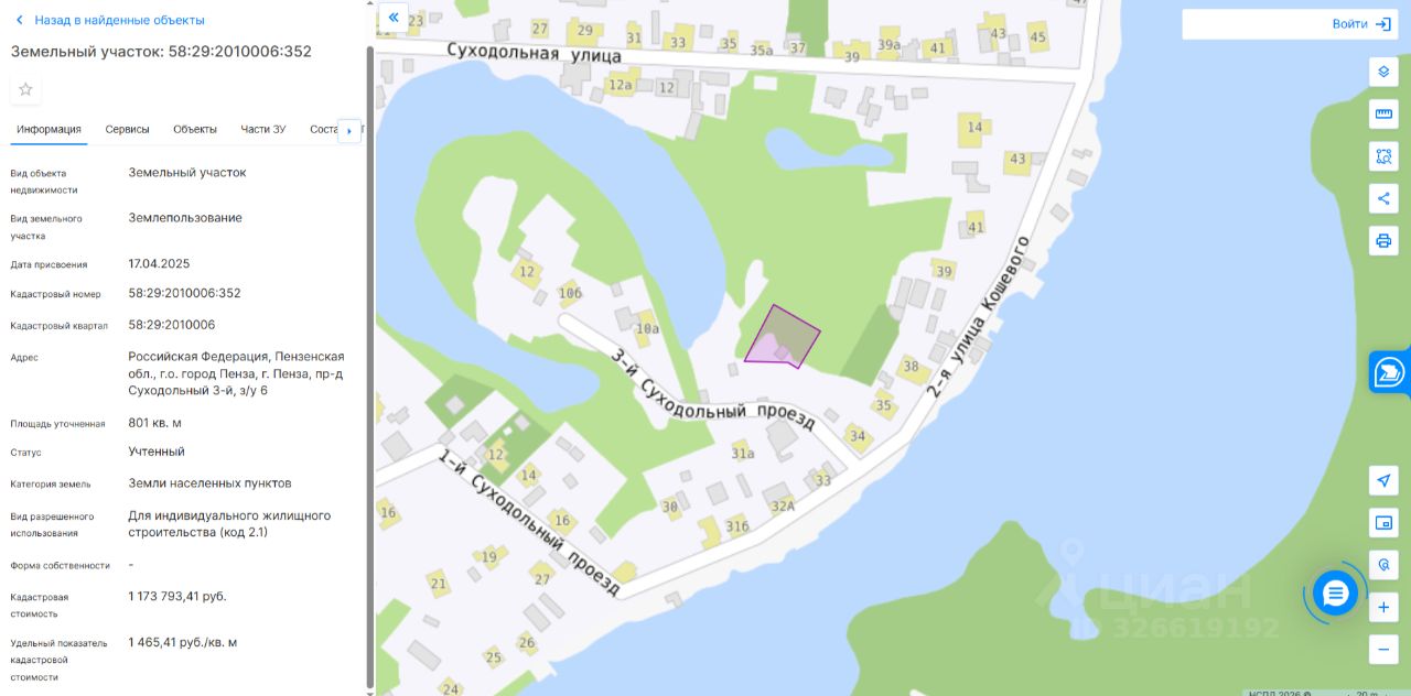 Адрес: Российская Федерация, Пензенская обл., г.о. город Пенза, г. Пенза, пр-д Суходольный 3-й, з/у 6. Площадь: 801 кв. м. Кадастровый номер: 58:29:2010006:352. Разрешенное использование (назначение): Для индивидуального жилищного строительства (код 2.1).