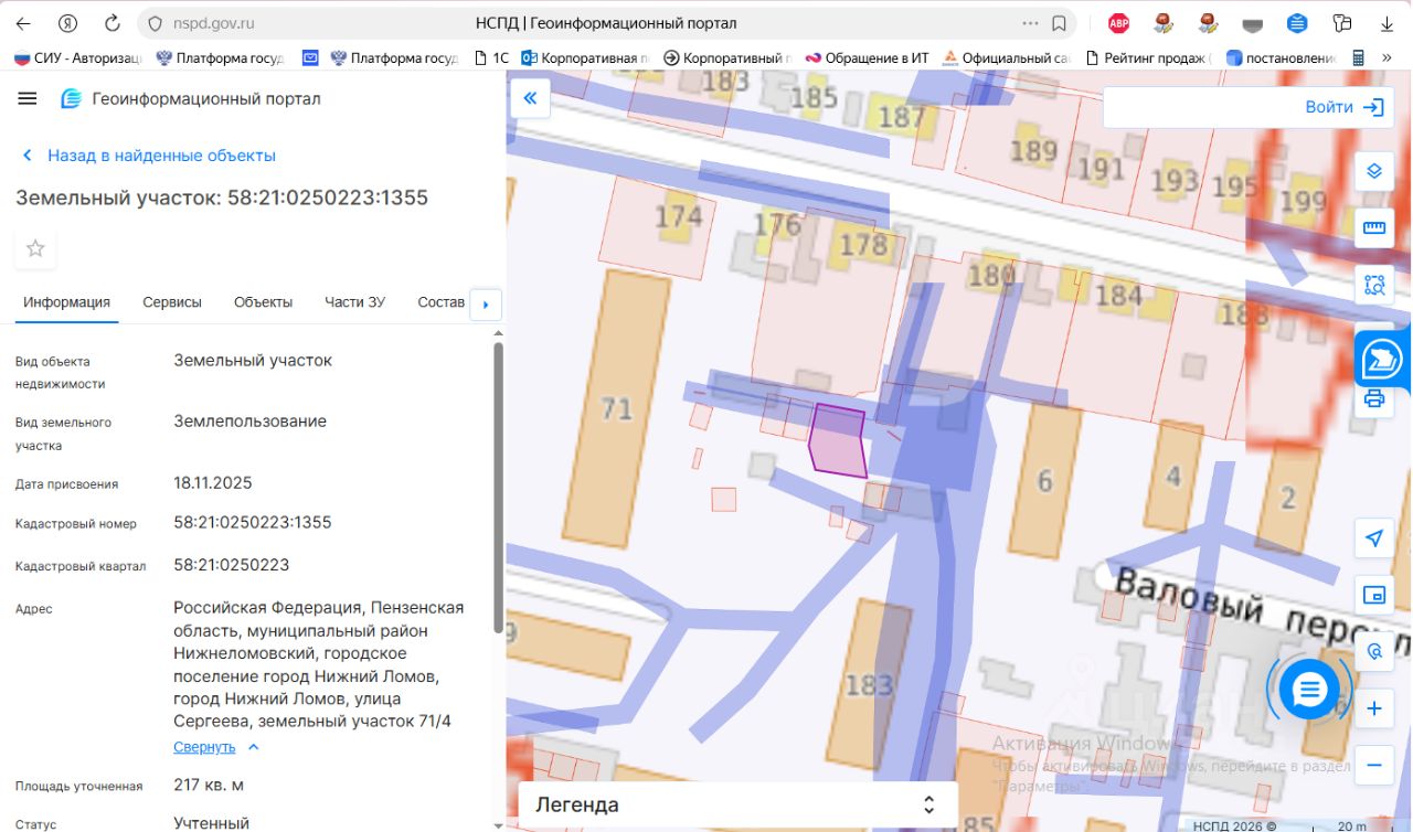 земельный участок из земель населенных пунктов, площадью 217 кв.м., местоположение: Пензенская область, Нижнеломовский район, г. Нижний Ломов, ул. Сергеева, земельный участок 71/4, с кадастровым номером 58:21:0250223:1355, разрешенное использование: "размещение гаражей для собственных нужд".
