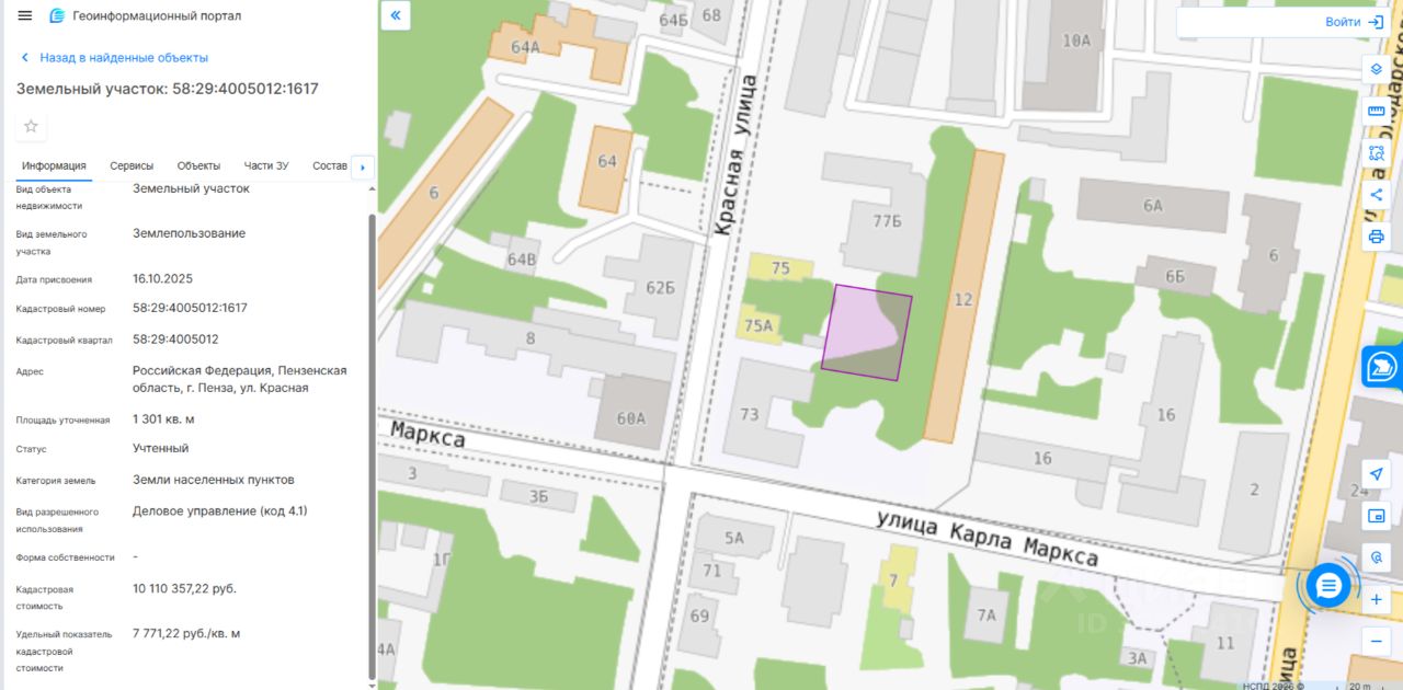 Адрес: Российская Федерация, Пензенская область, г. Пенза, ул. Красная. Площадь: 1301 кв. м. Кадастровый номер: 58:29:4005012:1617. Разрешенное использование (назначение): Деловое управление (код 4.1).