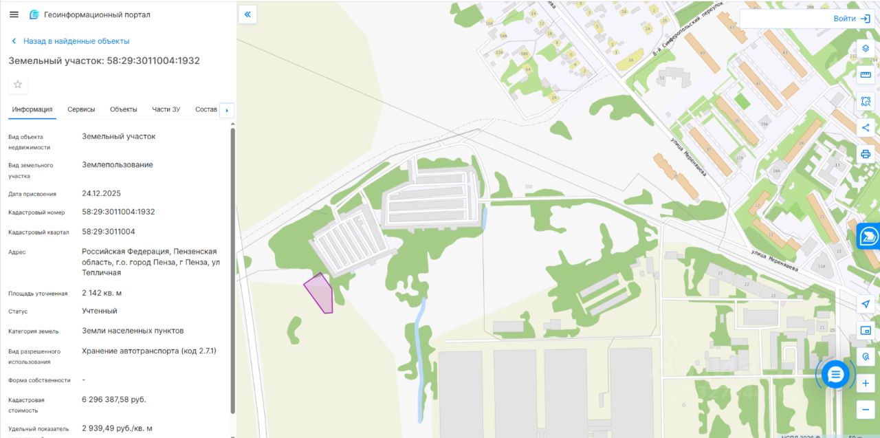 Адрес: Российская Федерация, Пензенская область, г.о город Пенза, г Пенза, ул Тепличная. Площадь: 2142 кв. м. Кадастровый номер: 58:29:3011004:1932. Разрешенное использование (назначение): Хранение автотранспорта (код 2.7.1).