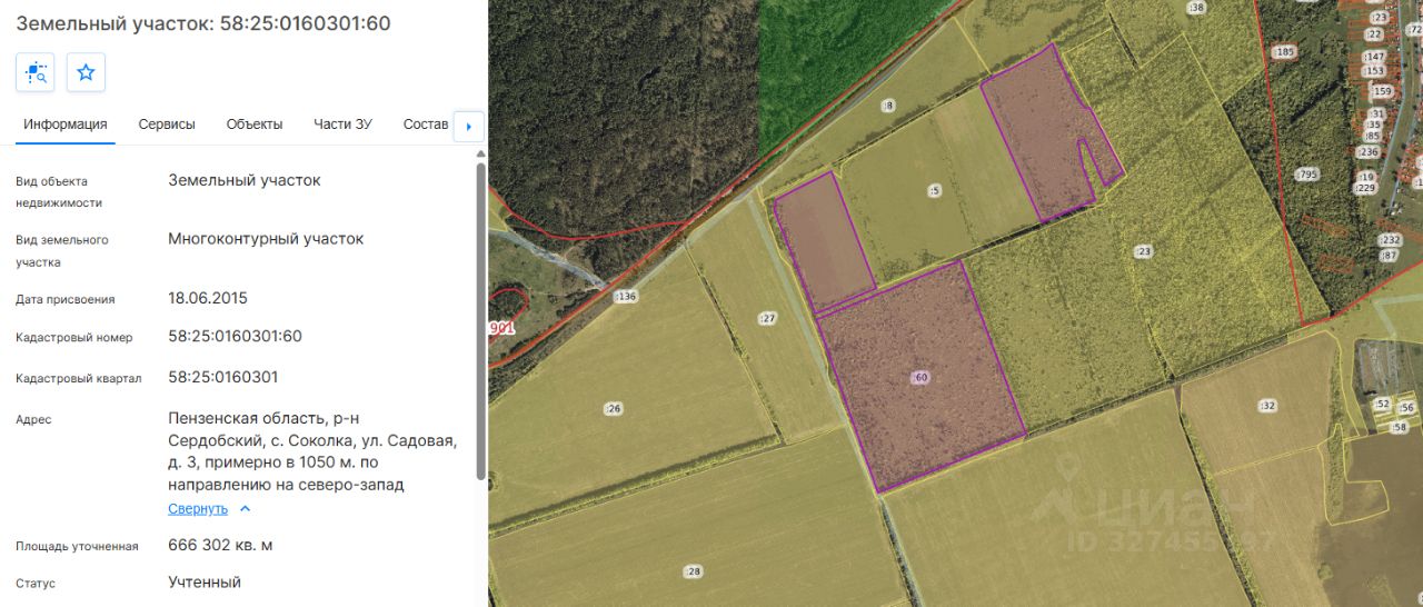 Земельный участок из категории земель - земли сельскохозяйственного назначения, разрешенное использование для сельскохозяйственного производства, с кадастровым номером 58:25:0160301:60 общей площадью 666302 кв.м, адрес (местоположение) объекта: местоположение установлено относительно ориентира, расположенного в границах участка, почтовый адрес ориентира: Пензенская область, Сердобский район, с. Соколка, ул. Садовая, д.3, примерно в 1050 м по направлению на северо-запад. Цель использования земельного участка - для ведения сельскохозяйственного производства.