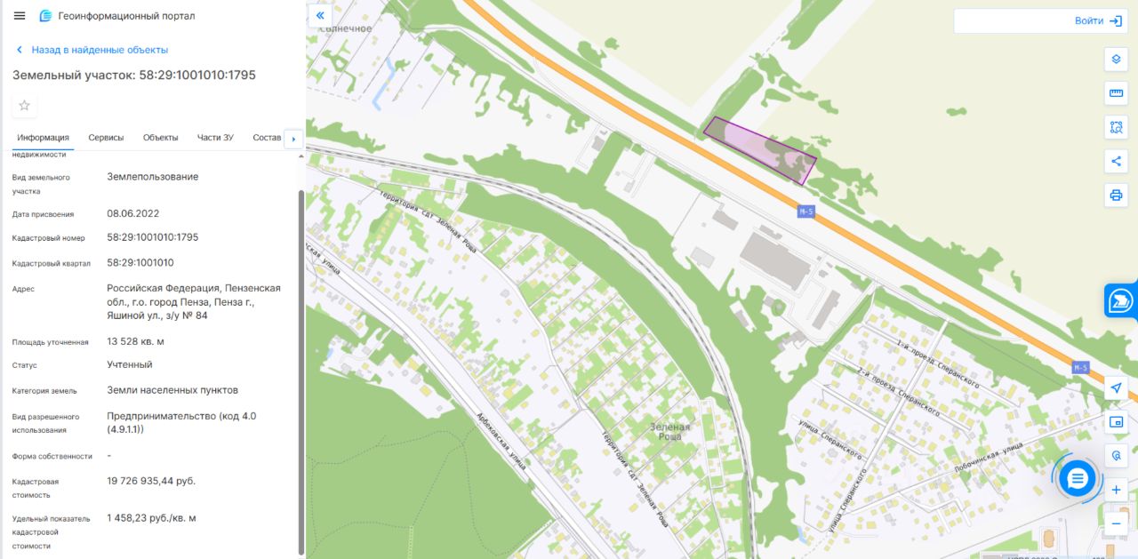 Адрес: Российская Федерация, Пензенская обл., г.о. город Пенза, Пенза г., Яшиной ул., з/у 84. Площадь: 13528 кв. м. Кадастровый номер: 58:29:1001010:1795. Разрешенное использование (назначение): Предпринимательство (код 4.0 (4.9.1.1)).