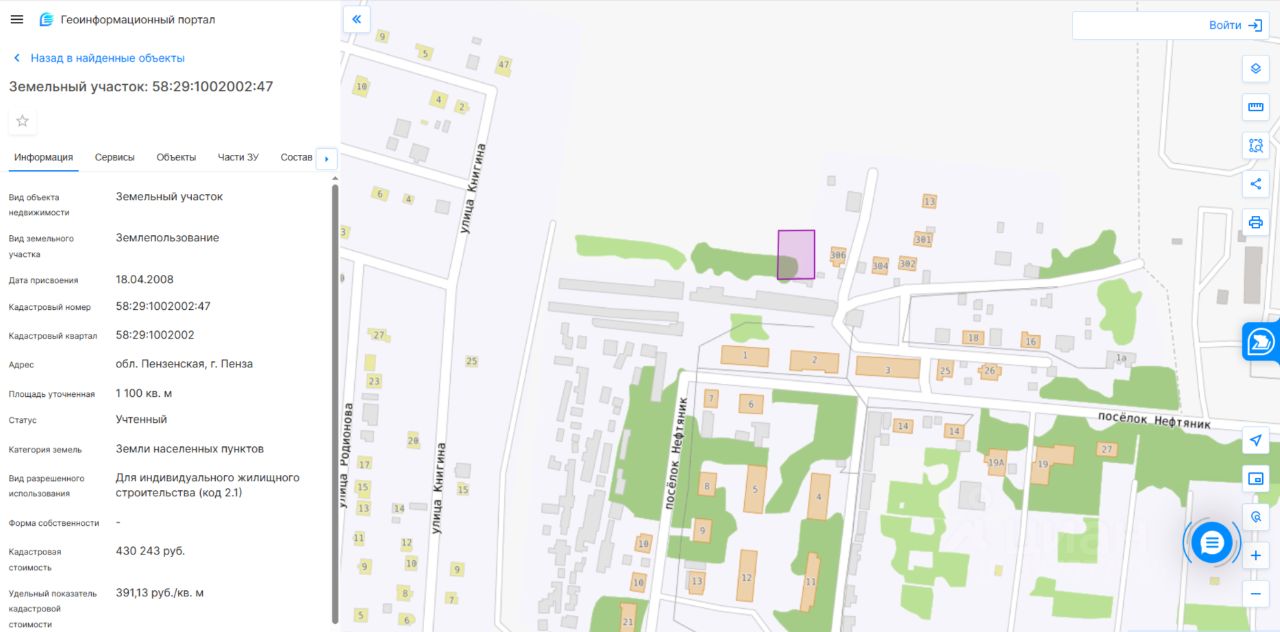 Адрес: Местоположение установлено относительно ориентира, расположенного в границах участка. Ориентир севернее пос. Нефтяник, стр. 2. Почтовый адрес ориентира: обл. Пензенская, г. Пенза. Площадь: 1100 кв. м. Кадастровый номер: 58:29:1002002:47. Разрешенное использование (назначение): Для индивидуального жилищного строительства (код 2.1).