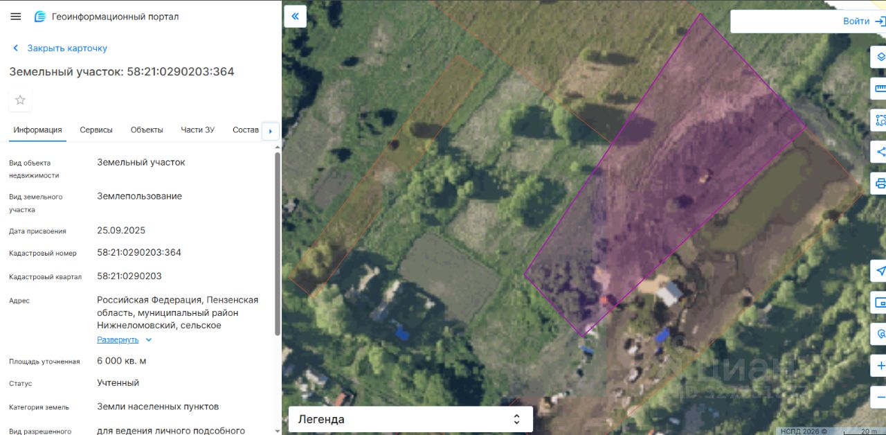 Земельный участок из земель населенных пунктов с кадастровым номером 58:21:0290203:364, разрешенное использование для ведения личного подсобного хозяйства (приусадебный земельный участок) (код 2.2), площадью 6000 кв.м, адрес (описание местоположения): Пензенская область, Нижнеломовский район, Усть-Каремшинский сельсовет, с. Усть-Каремша, улица Черная Пятина, земельный участок 77а.