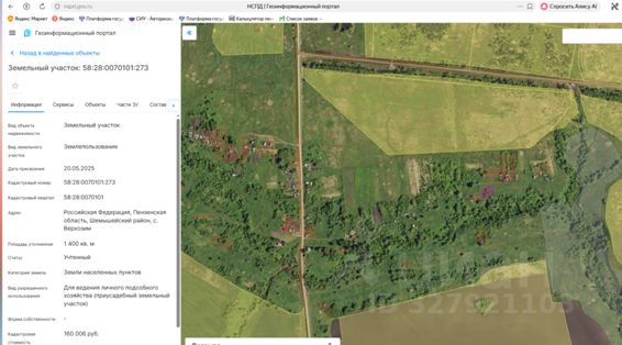 Земельный участок из земель населенных пунктов с кадастровым номером 58:28:0070101:273, общей площадью 1400 кв.м., с видом разрешенного использования для ведения личного подсобного хозяйства (приусадебный земельный участок) , расположенный по адресу: Российская Федерация, Пензенская область, Шемышейский район, с.Верхозим.