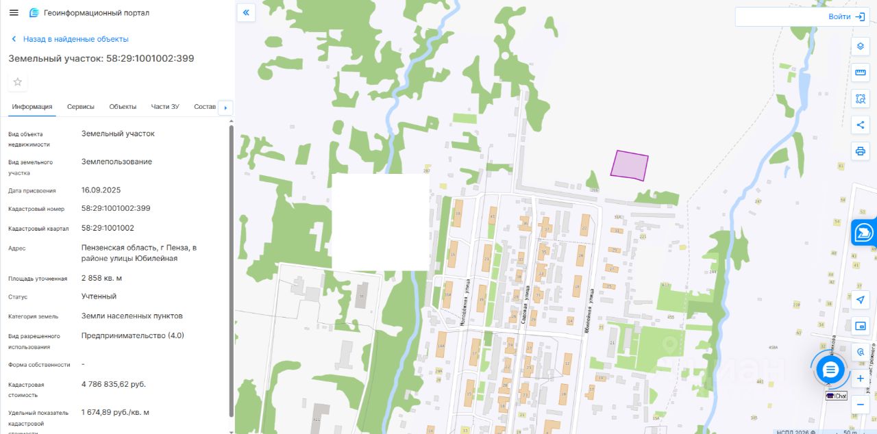 Адрес: Пензенская область, г Пенза, в районе улицы Юбилейная. Площадь: 2858 кв. м. Кадастровый номер: 58:29:1001002:399. Разрешенное использование (назначение): Предпринимательство (4.0).