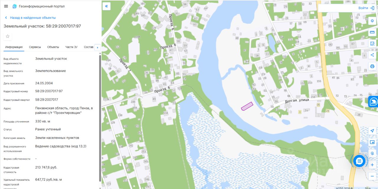 Адрес: Пензенская область, город Пенза, в районе с/т "Проектировщик". Площадь: 330 кв. м. Кадастровый номер: 58:29:2007017:97. Разрешенное использование (назначение): Ведение садоводства (код 13.2).