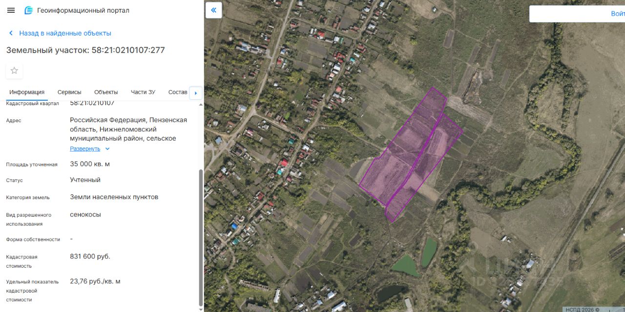 Земельный участок из земель населенных пунктов с кадастровым номером 58:21:0210107:277, разрешенное использование сенокосы, площадью 35000 кв.м, адрес (описание местоположения): Пензенская область, Нижнеломовский район, Верхнеломовский сельсовет, село Верхний Ломов, улица Московская, земельный участок 59.
