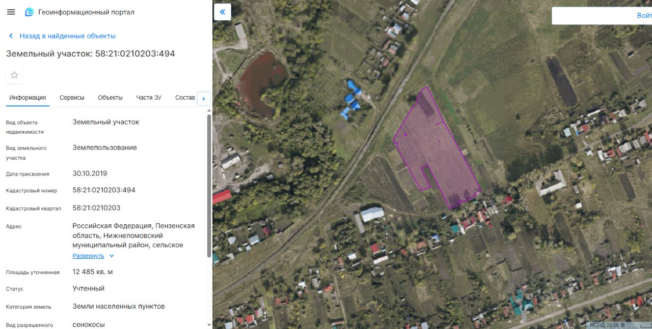 Земельный участок из земель населенных пунктов с кадастровым номером 58:21:0210203:494, разрешенное использование сенокосы, площадью 12485 кв.м, адрес (описание местоположения): Пензенская область, Нижнеломовский район, Верхнеломовский сельсовет, село Верхний Ломов, улица Белинского, земельный участок 65.