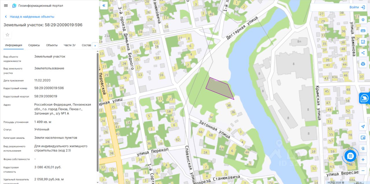 Адрес: Российская Федерация, Пензенская обл., г.о. город Пенза, Пенза г., Затонная ул., з/у 1 А. Площадь: 1499 кв. м. Кадастровый номер: 58:29:2009019:596. Разрешенное использование (назначение): Для индивидуального жилищного строительства (код 2.1).
