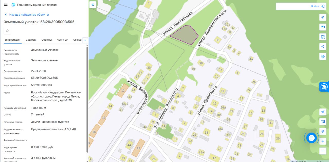 Адрес: Российская Федерация, Пензенская обл., г.о. город Пенза, город Пенза, Боровиковского ул., з/у 29. Площадь: 1864 кв. м. Кадастровый номер: 58:29:3005003:595. Разрешенное использование (назначение): предпринимательство (4.0(4.4)).