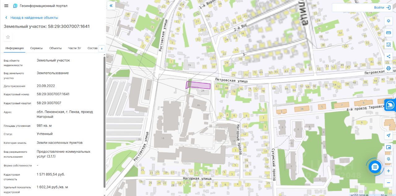 Адрес: обл. Пензенская, г. Пенза, проезд Нагорный. Площадь: 981 кв. м. Кадастровый номер: 58:29:3007007:1641. Разрешенное использование (назначение): Предоставление коммунальных услуг (3.1.1).