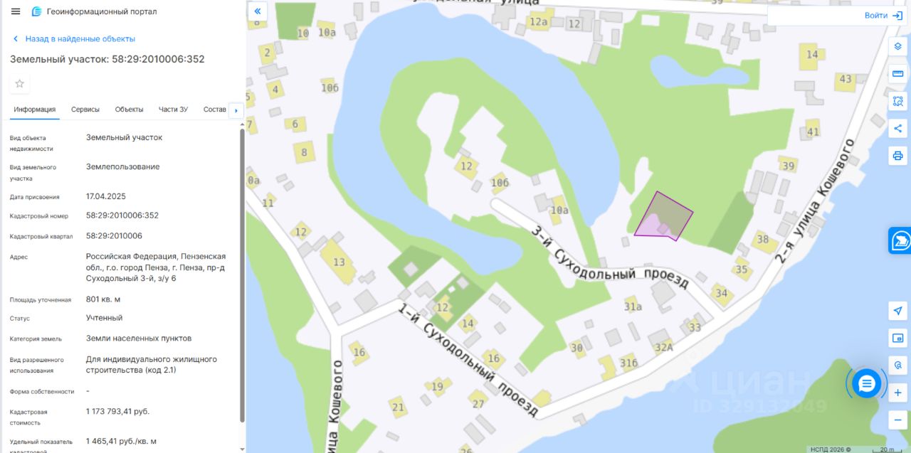 Адрес: Российская Федерация, Пензенская обл., г.о. город Пенза, г. Пенза, пр-д Суходольный 3-й, з/у 6. Площадь: 801 кв. м. Кадастровый номер: 58:29:2010006:352. Разрешенное использование (назначение): Для индивидуального жилищного строительства (код 2.1).