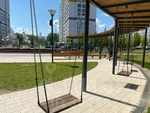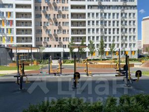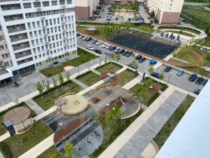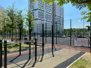 Во дворе детская площадка и уличные тренажеры.