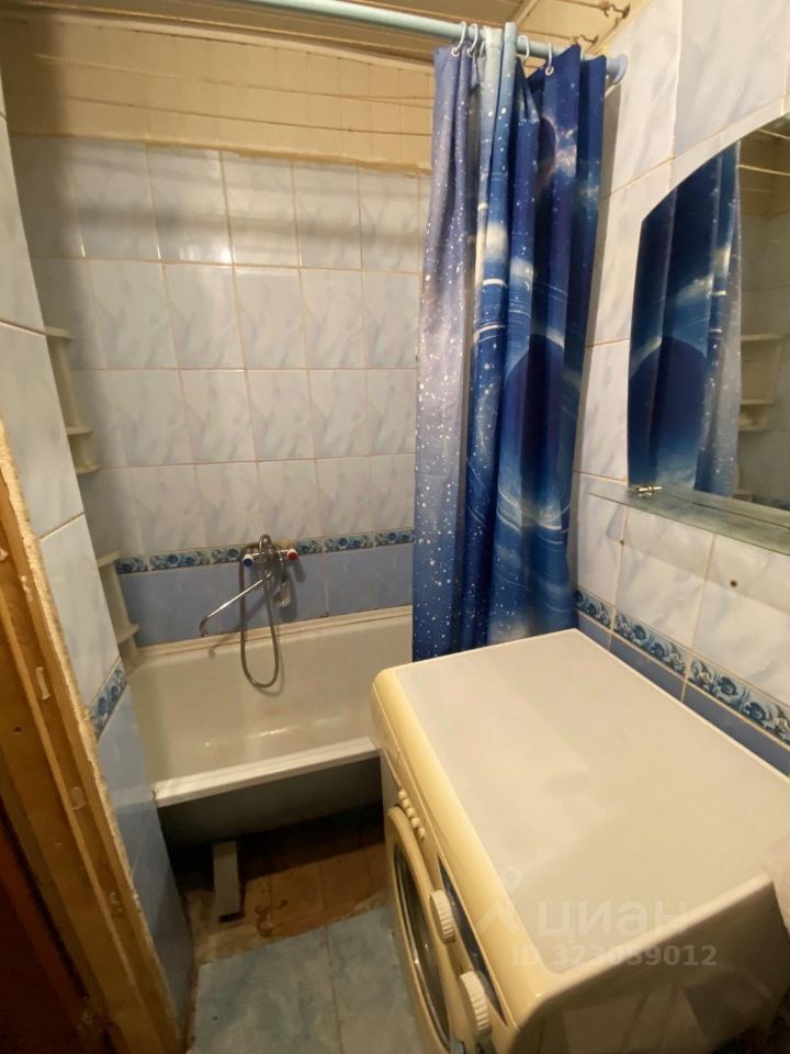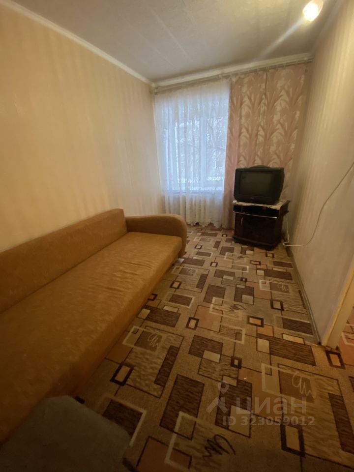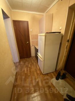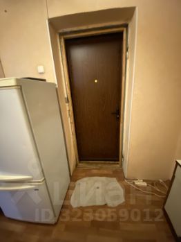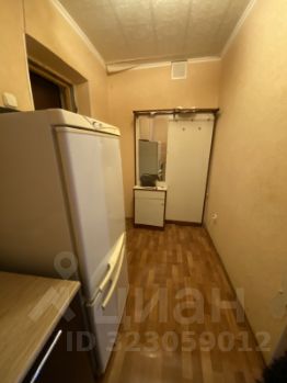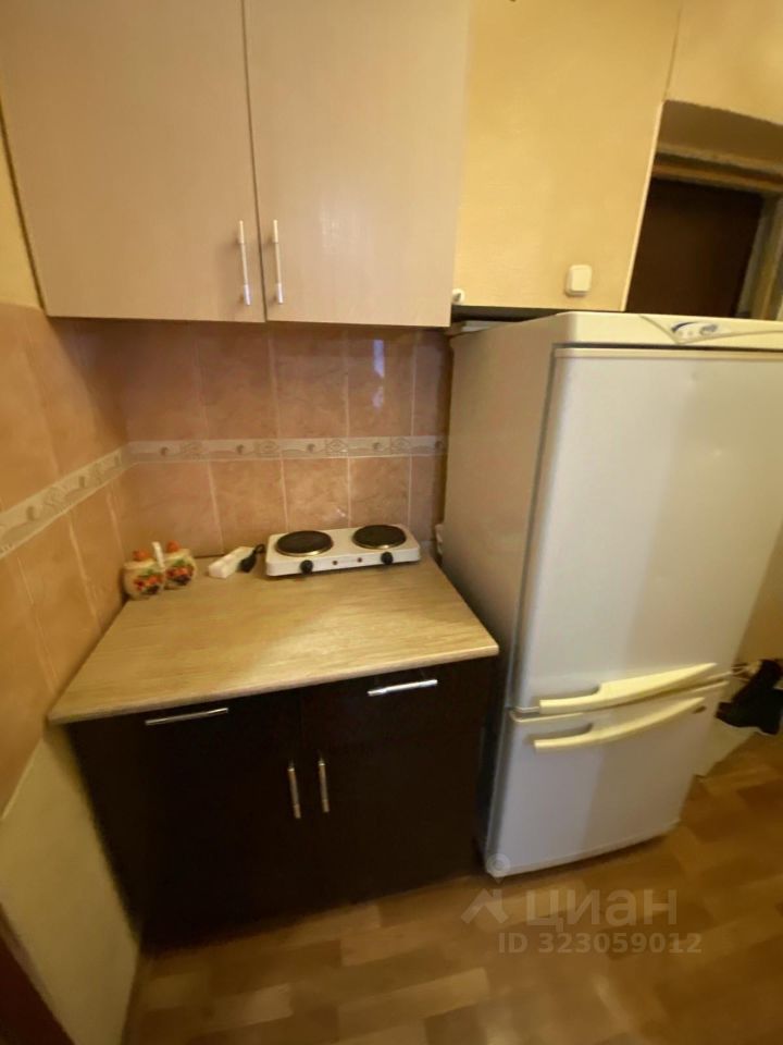 Выполнена перепланировка, квартира разделена на 2 небольших комнаты с 2-мя диванами, шкафом и телевизором, прихожую с кухонными шкафами и холодильником и совмещенным санузлом с ванной и стиральной машиной.
