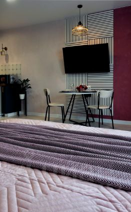 - Техника: SmartTv с набором цифровых каналов, холодильник, варочная панель, вытяжка, микроволновая печь, чайник, стиральная машина, кондиционер, гладильная доска, утюг, фен