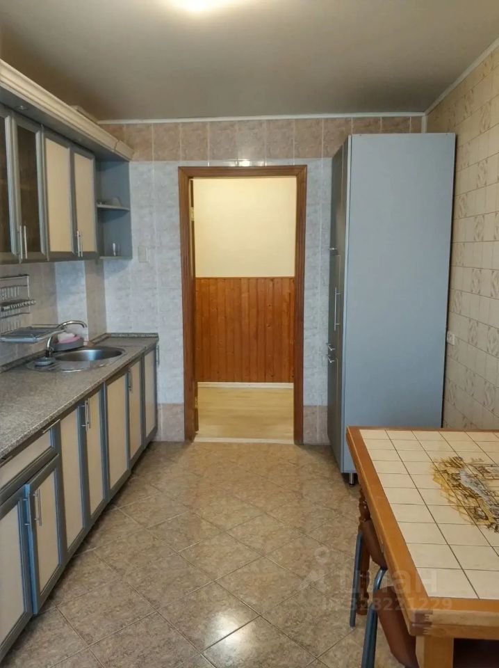 Кухня: кухонный гарнитур, большой холодильник с морозильной камерой, плита, духовка, микроволновка, электрический чайник, большой кухонный стол и минимальный набор посуды. Кухня очень просторная.